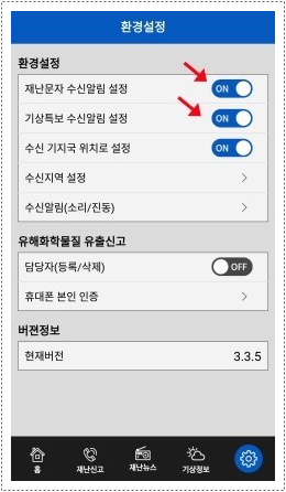 4. 홈 화면 우측 '환경설정 - 재난문자 수신알림 설정 On