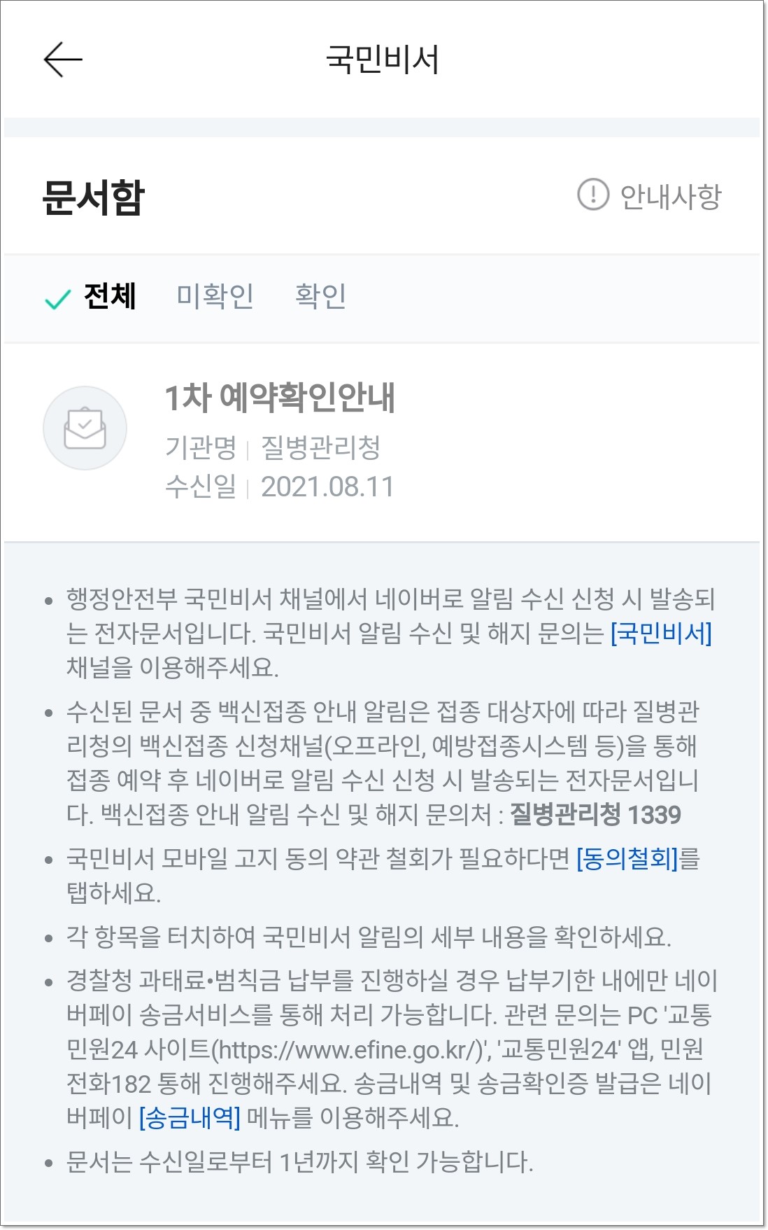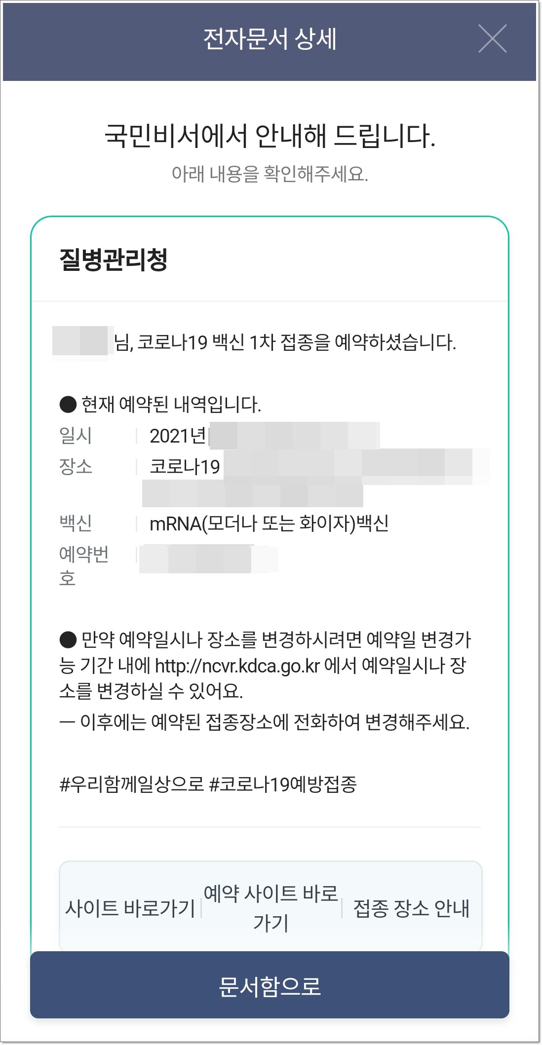 여기에서 로그인하신 후 국민 비서를 선택하면 본인인증을 다시 요청합니다. 지문인증 등 설정해놓은 개인 인증을 마치면 아래와 같이 접종 예약을 확인하실 수 있습니다. 네이버 이외에 카카오톡이나 토스를 선택하신 분들도 해당 플랫폼에서 동일하게 확인하실 수 있습니다.