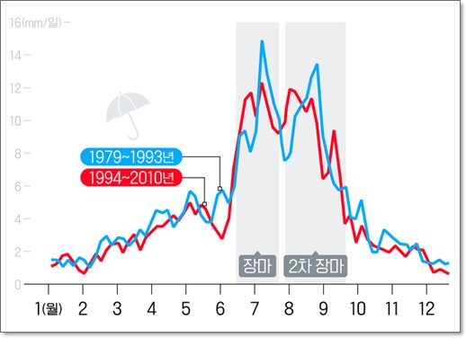 1990년대 이전에는 6월 중순이후 장마가 시작되어 7월 중순에 강수량이 집중되었습니다. 하지만 그 이후에는 여름 장마와 가을장마의 강수량이 비슷해져, 7월에 비가 줄어들고 8월에 비가 많이 늘었습니다. 이는 기후변화 때문으로 추정하는데, 그로 인해 6월부터 이른 무더위가 시작되고, 가을 장마가 지속되고, 9월에 국지성 호우와 때늦은 태풍까지 찾아오고 있습니다.