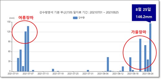 특히 부산지역의 강수량을 보면 여름 장마기간이었떤 지난달보다 이번 달(8월) 들어 더 많은 비가 내리고 있습니다. 특히 8월 25일에 내렸던 집중호우는 여름 장마보다 더 많은 비를 내려 가을장마의 무서움을 알려주고 있습니다.